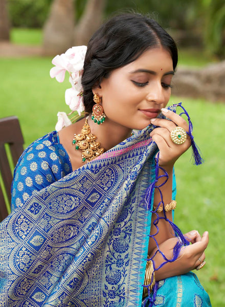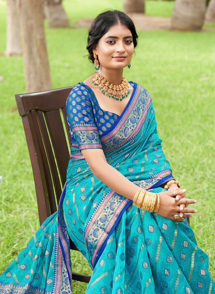 Want something striking yet sophisticated for festive occasions? The light blue color and zari work balance boldness with grace.
