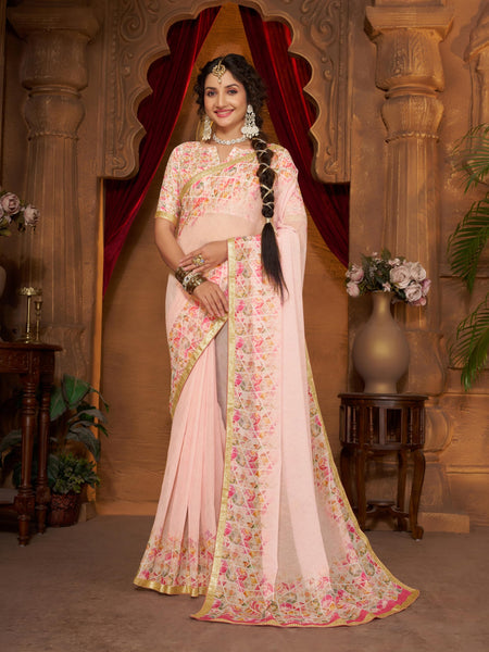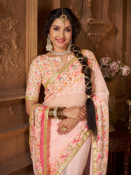 Designed for women who appreciate comfort without sacrificing style, this saree features a delicate lace border, adding a refined and graceful touch. With a total length of 6.3 meters (5.5 meters saree + 0.8 meters unstitched blouse), it offers versatility for personalized styling. Its pastel Pink shade enhances your natural glow and gives a fresh, feminine appearance suitable for both day and evening events.