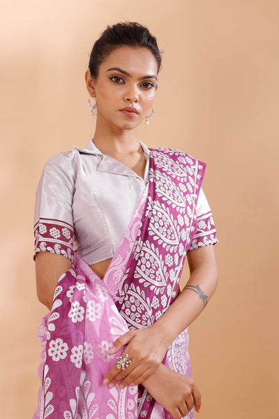Beautiful floral patterns give the saree a lively and feminine touch.