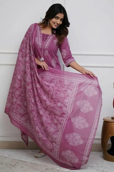 Infuse your ethnic wardrobe with timeless charm and breathable comfort with the Brand: Jashiya PARTHVI Wine Kurta Set. Thoughtfully crafted for the modern woman who values tradition, this 3-piece ensemble features a printed cotton kurta with handwork detailing, a matching cotton bottom, and a flowy mulmul dupatta — creating a head-to-toe look that feels just as good as it looks.
