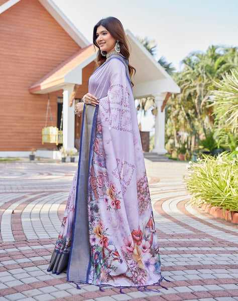 The saree features a beautifully detailed digital floral striped print, enhanced with a graceful Dola Border, giving it an exquisite visual appeal. Its Purple shade adds depth, sophistication, and a royal touch, making it ideal for women of all ages. Whether you're attending a grand event or simply elevating your daily wardrobe, this saree ensures you stand out effortlessly.